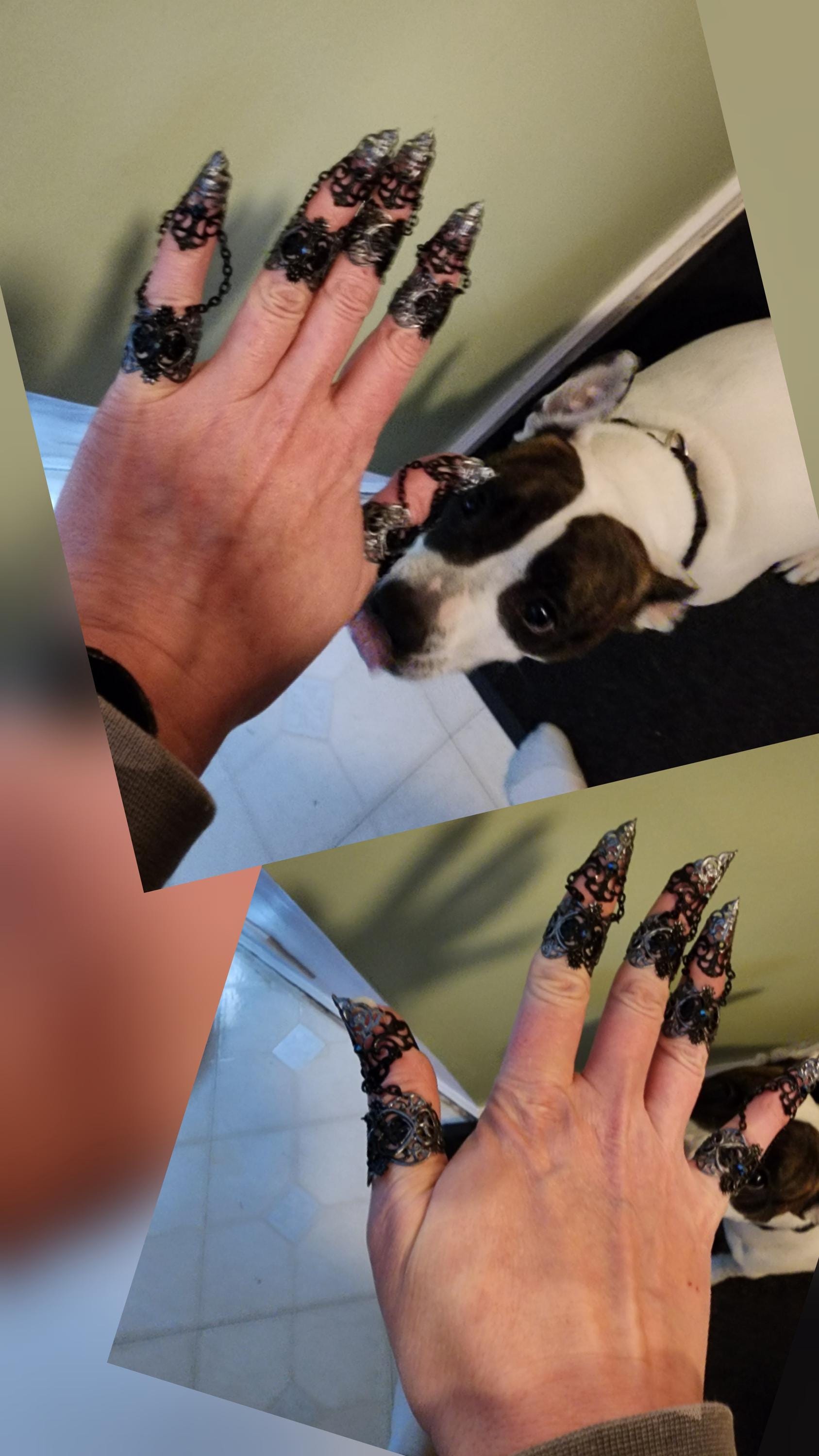 Delightful colours of gun silver and black with our famous claws attached at the finger point (which is also adjustable) adorned lovingly with gems so give them that extra flash of bling